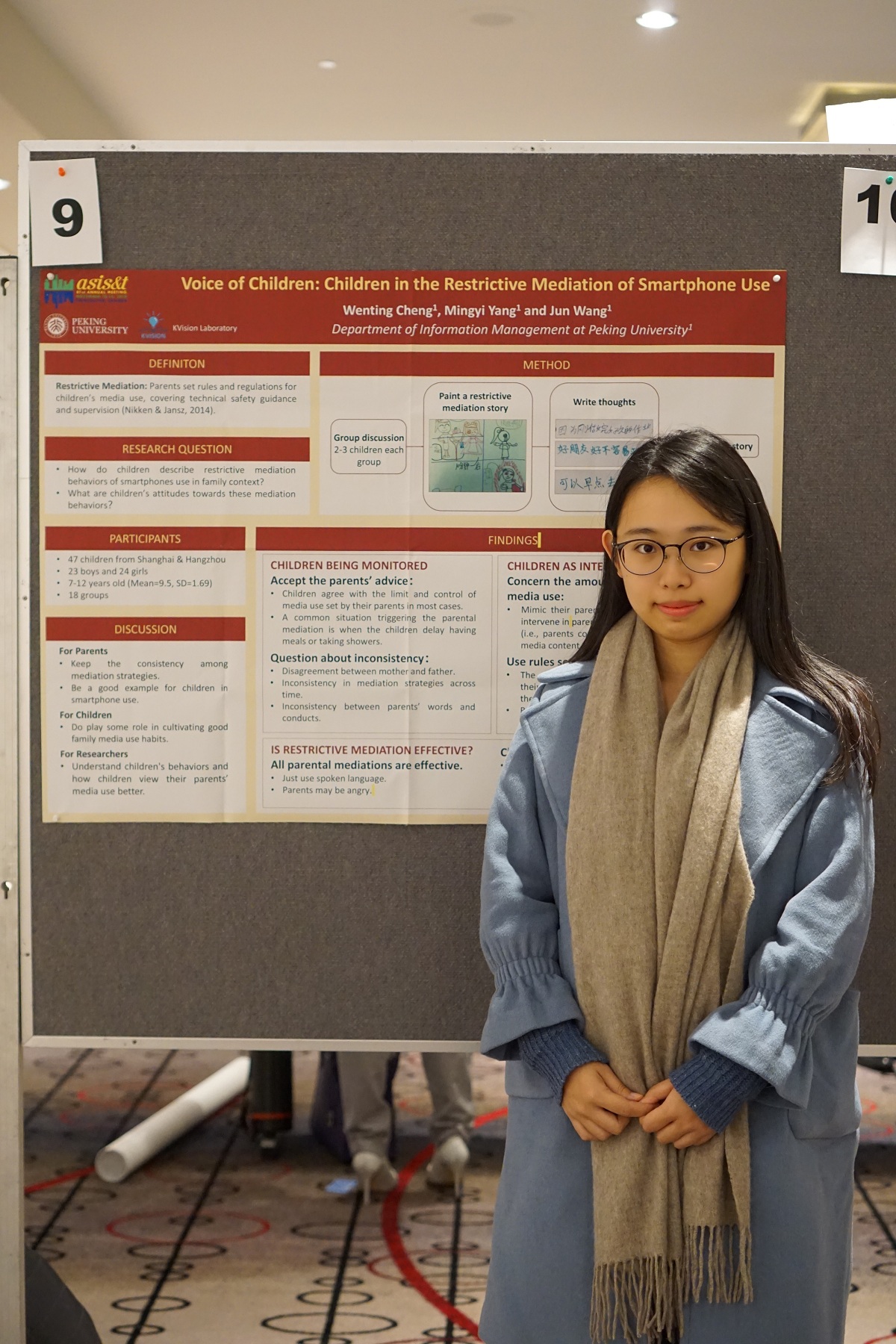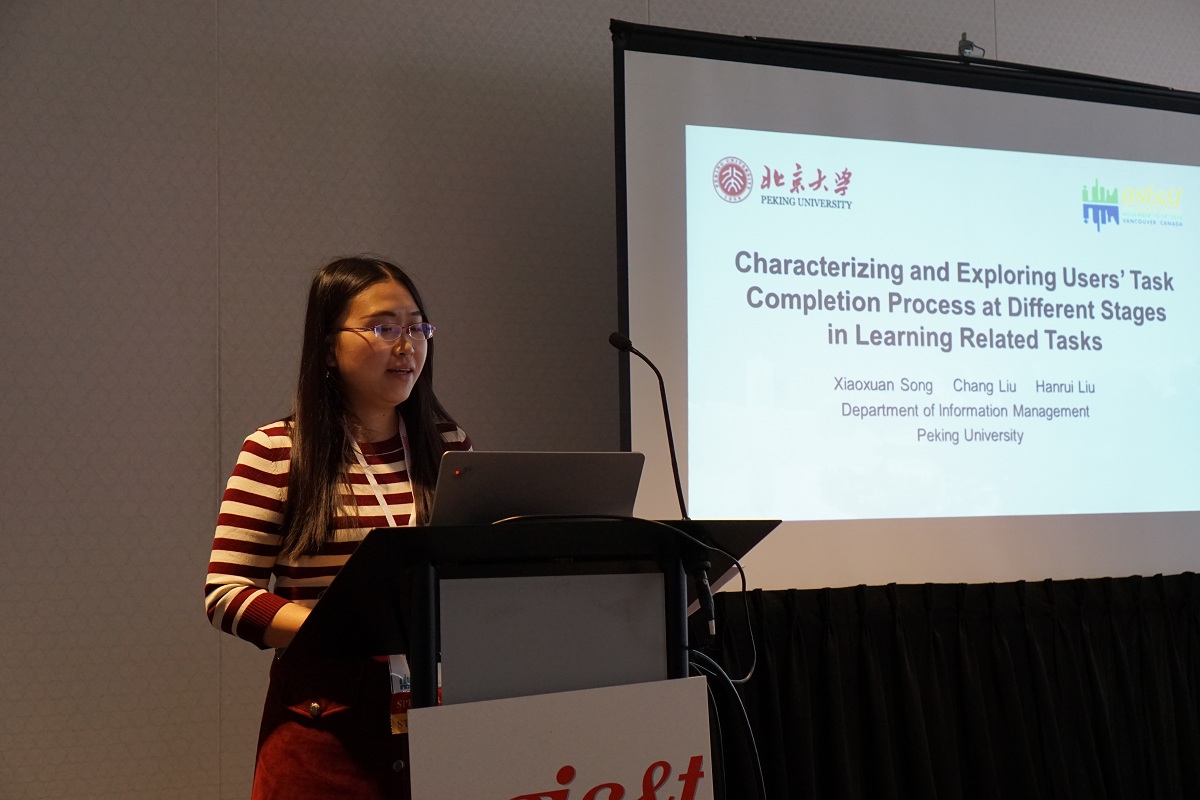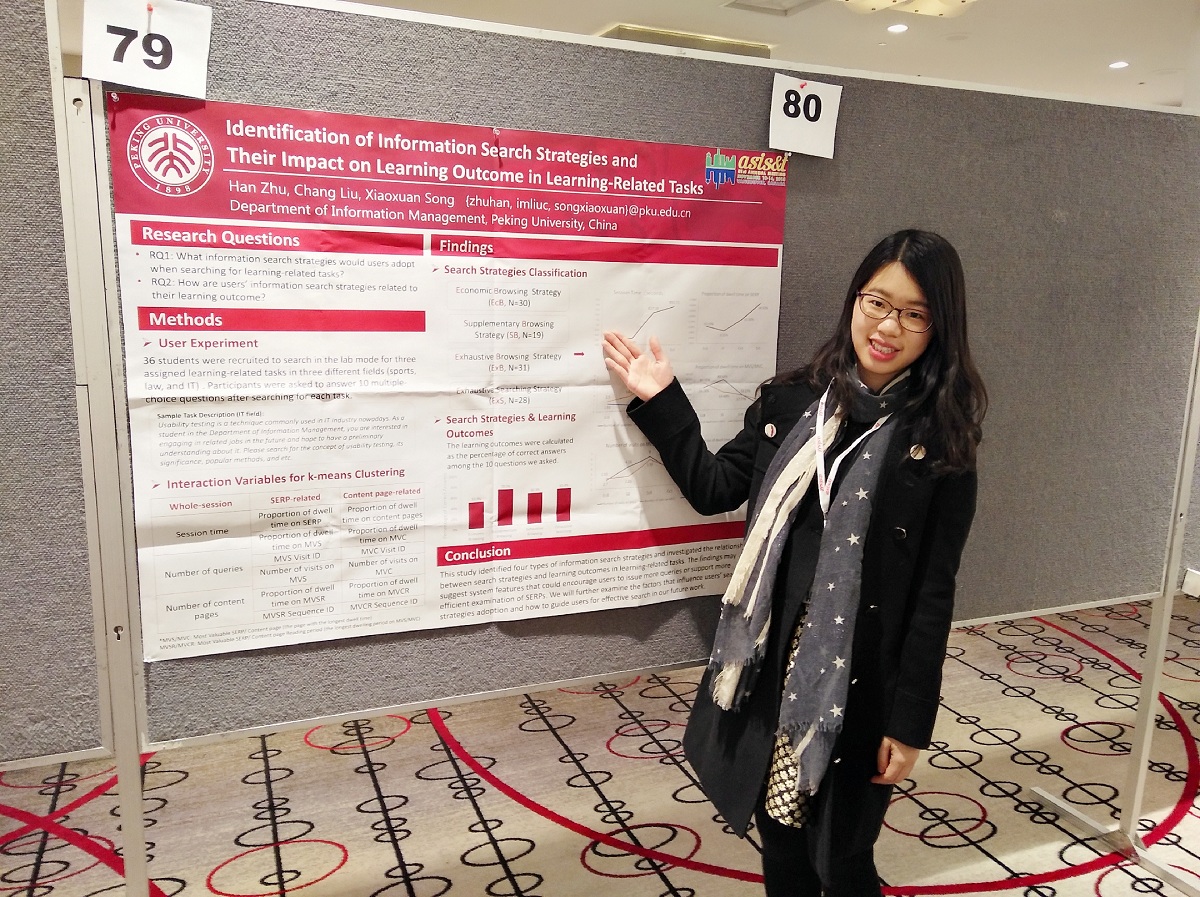 今年,宋筱璇同学、刘畅老师和刘涵蕊同学合作完成的长文章《Characterizing and Exploring Users’ Task Completion Process at Different Stages in Learning Related Tasks》被会议录用并进行了展示,这一关于“搜索即学习”(searchaslearning)的研究在会场收获了很多的讨论,激发了新的研究兴趣。同样被录用的还有我系师生合作完成的两篇海报:程文婷同学、杨明仪同学和王军老师合作完成的海报《Voice of Children: Children in the Restrictive Mediation of Smartphone Use》聚焦于少年儿童的信息行为,从儿童视角探讨限制型干预手机使用的角色、态度及行为;祝晗同学、刘畅老师和宋筱璇同学合作完成的海报《Identification of Information Search Strategies and Their Impact on Learning Outcome in Learning Related Tasks》关注学习型任务中搜索策略的识别和结果评估,也引发了广泛的探讨。