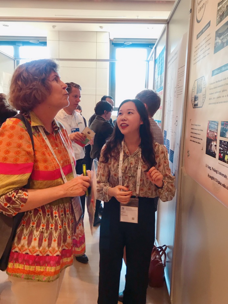 张皓珏同学的学术海报《More Partnerships for Better Equitable Library Service in China》被本届大会录用并在海报会议中展示和交流。这一海报主要向大家展示了近年来我国社会力量参与公共文化机构管理运营,特别是图书馆社会化发展的一些创新实践,以期为更多伙伴加入到公共图书馆服务的队伍中,为社会公众提供更好的图书馆服务提供思考、借鉴。该研究成果引发了国内外参会人员对我国公共文化发展的关注,来自北京科技大学图书馆的参会代表、瑞士弗里堡大学(Université de FribourgFribourg)的Donatus Duesterhaus等都表示这些创新案例非常有价值,可以考虑进一步的宣传与推广。