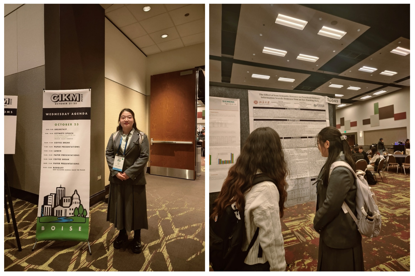 杨佳琪同学和王翩然老师合作了题为《The Effect of Icon Semantic Distance on Preschool Children's Information Search : Evidence from an Eye-Tracking Study》的短论文并在会议现场展示了学术海报。该研究引入了语义距离理论衡量面向儿童的图画书搜索中图标的明确性,以团队自主开发的图画书标识系统为实验材料,运用眼动追踪技术的行为实验法探究了学龄前儿童使用该标识系统进行查询时的正确率、判断反应时以及呈现的注视模式。该研究在一定程度上揭示了学龄前儿童进行信息查询时的认知机制和检索策略,有助于开发更有效的、对儿童更友好的信息搜索系统。