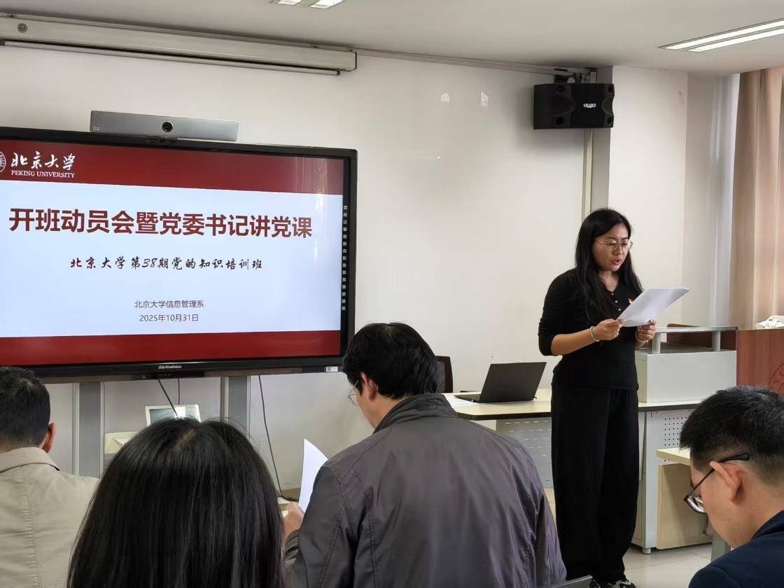 2025年10月31日下午,信息管理系在方李邦琴楼414室举行第38期党的知识培训班开班仪式暨党委书记讲党课。信息管理系党委书记李胜,系党委副书记索天艺,系副主任、党委委员徐扬,情报学党支部书记、教研室副主任李胜利,系综合办公室主任吴施雨,系党委组织员余方博,学生工作办公室副主任税远志,以及部分党员师生代表和全体初党学员共同参加了本次活动。会议由系党委副书记索天艺主持。