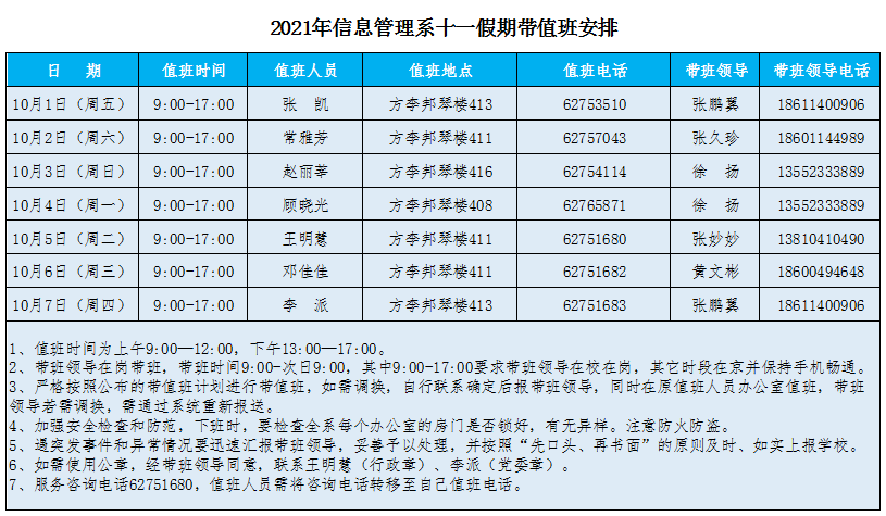 2021年信息管理系十一假期带值班安排