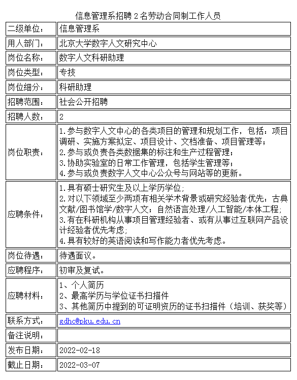 信息管理系招聘2名劳动合同制工作人员