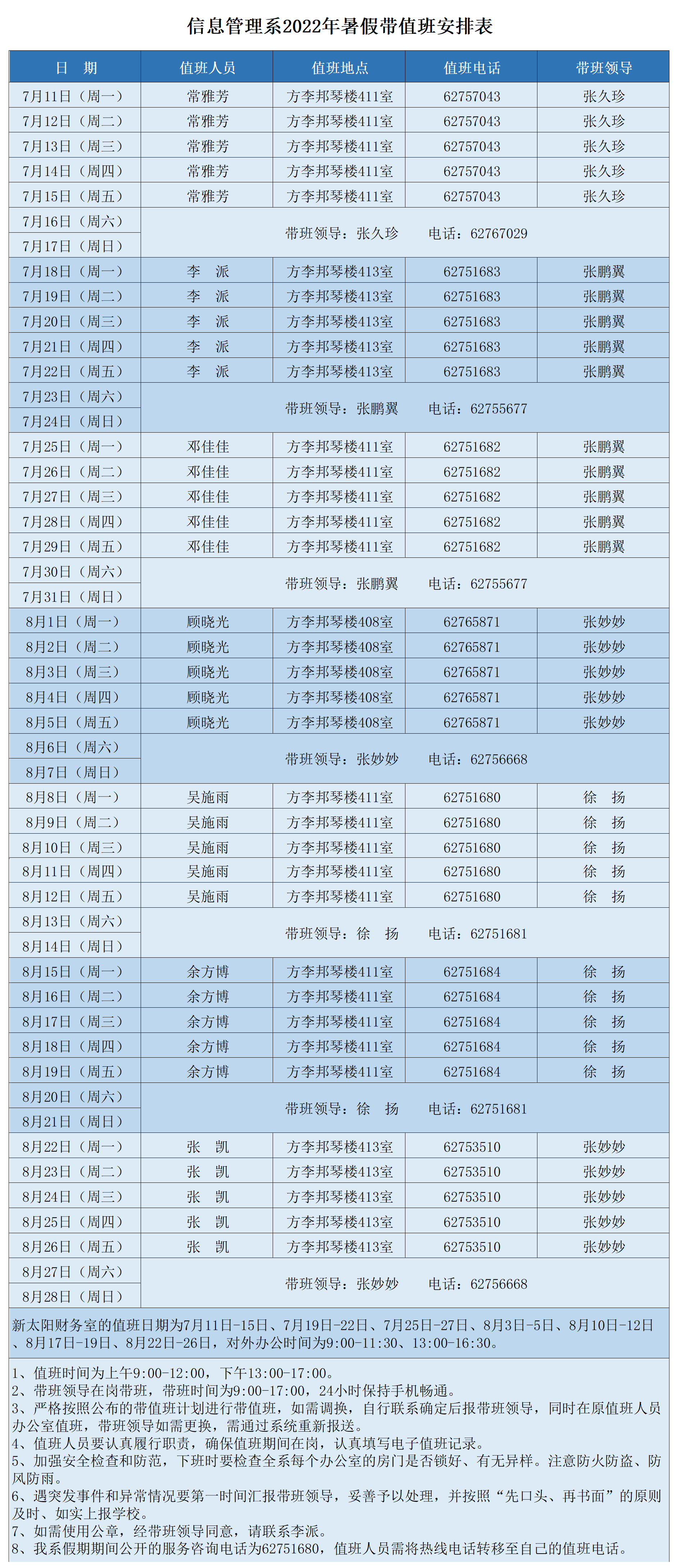 信息管理系2022年暑假带值班安排表