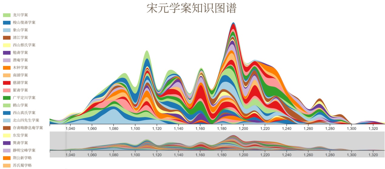王军带领数字图书馆实验室的同学们,用了一年时间,完成了“《宋元学案》知识图谱可视化系统”的设计和研发。《宋元学案》是中国学术思想史上的一部巨著,共240万字巨著,记录了宋代理学两千多学人近100个学术流派的传承和流衍情况。该项目利用中华书局提供的数字化文本,将学案中的人物、时间、地点、著作及他它们之间的复杂语义关系提取出来构造成知识图谱,提供可视化展现、交互式浏览、语义化查询等功能。起伏的波浪生动地呈现了历史事件对理学发展的影响,宋元两朝400年间的学术传承一目了然。读者可以选取一个学派进行细致地观察和分析,可以观察到理学思想巨擘朱熹对宋代学术繁荣所做的贡献。