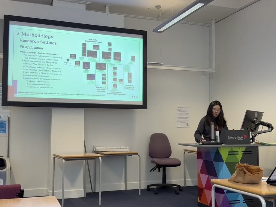 李文琦博士后、罗泽阳同学与张鹏翼老师合作的长论文“Exploring Immersive Cultural Heritage Experiences: A User Study of a VR Application Featuring Ancient Manuscripts”被会议录用,并在Digital Humanities分论坛进行了展示。这项混合方法用户研究深入探讨了VR技术在古文献类文化遗产数字化中的应用效果,并发现VR体验能有效激发公众对古籍历史背景与社会价值的兴趣,但也存在视听通道干扰、交互自由度不足等问题。研究提出了包含用户需求、信息通道、情节结构与设备交互四个维度的VR文化遗产体验设计框架,为古籍活化与沉浸式文化传播提供了重要的理论依据与实践指导。