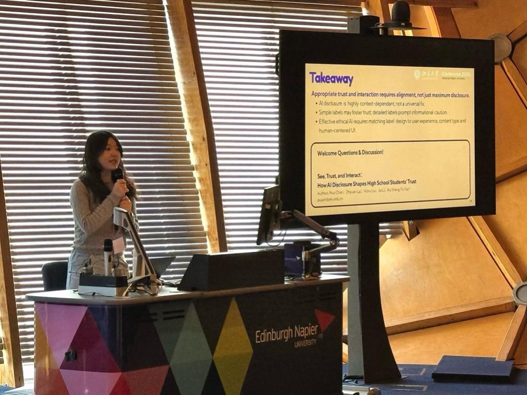 陈诺与赖智垣、刘逸初、李佳同学及闫蒲老师合作的长论文“See, Trust, and Interact: How AI Disclosure Shapes High School Students’ Trust”被会议录用,并在Information & Digital Literacies I分论坛进行了展示。该研究基于混合方法开展了田野实验,探讨披露标识对高中生对AI生成内容的注意力、信任与互动的影响,发现其效果具有显著的情境依赖性与群体差异,应结合内容类型与用户经验优化标识设计,以更好支持青少年的信息判断与信任校准。