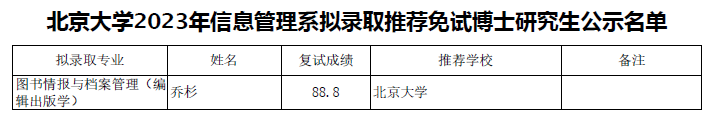 北京大学2023年信息管理系拟录取推荐免试博士研究生公示名单