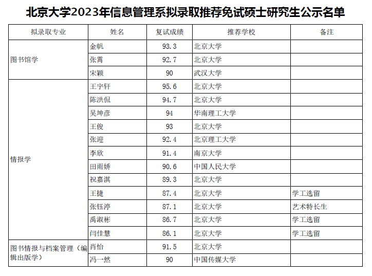 北京大学2023年信息管理系拟录取推荐免试硕士研究生公示名单